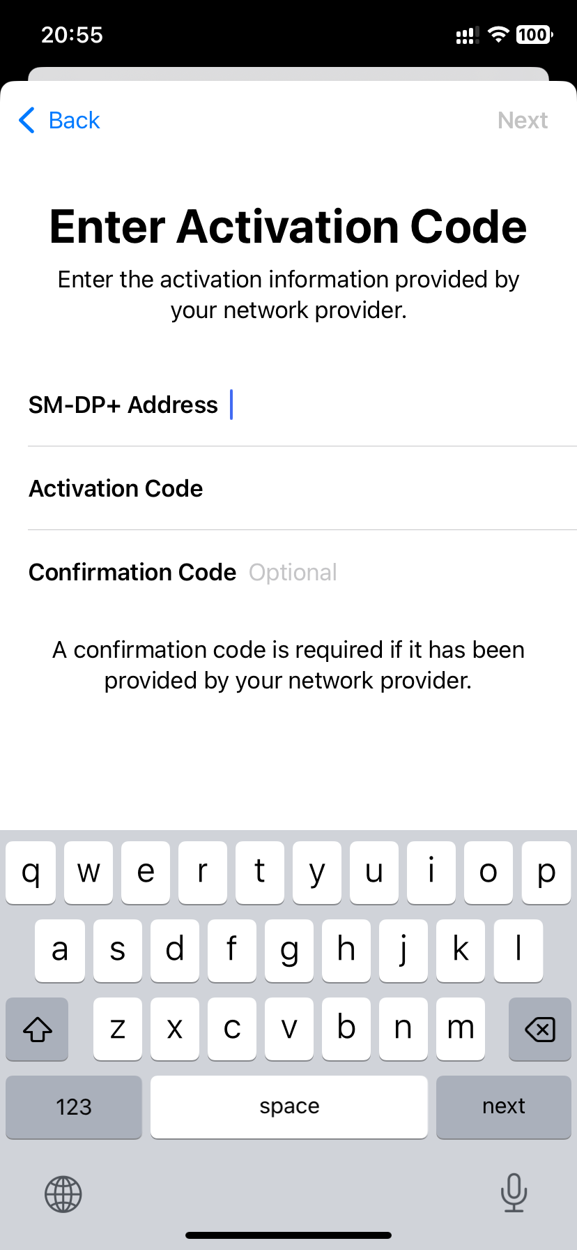 • Confirmation Code (required if provided by your eSIM provider or carrier)