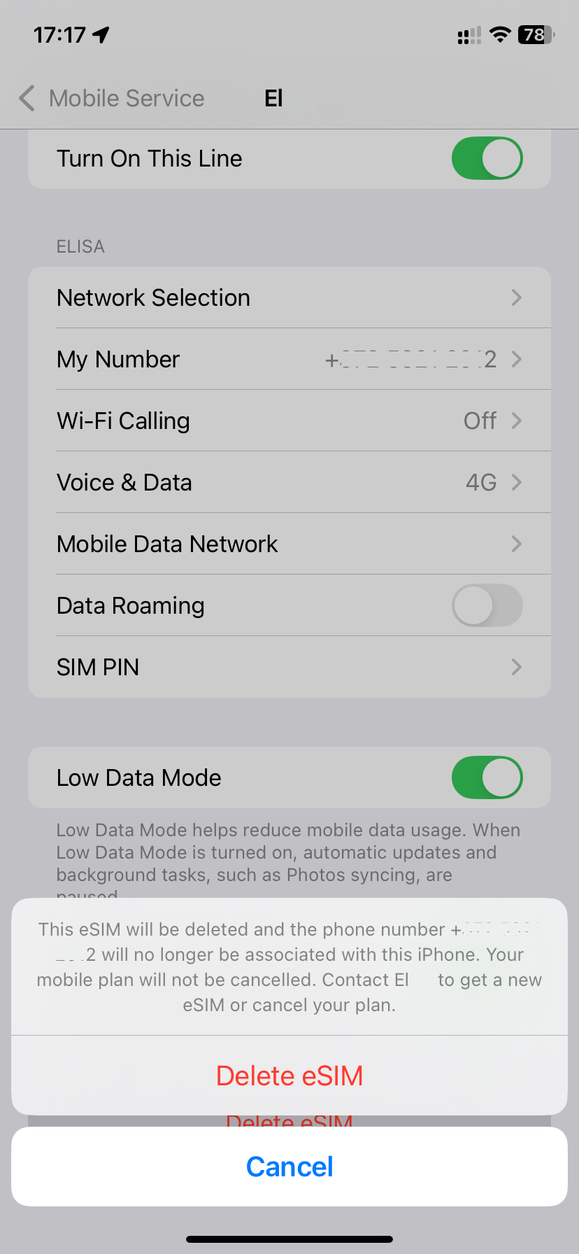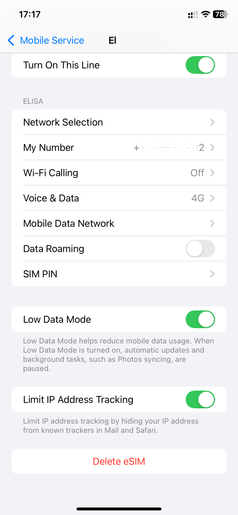 Scroll down the page with your eSIM details and tap Delete eSIM at the bottom: