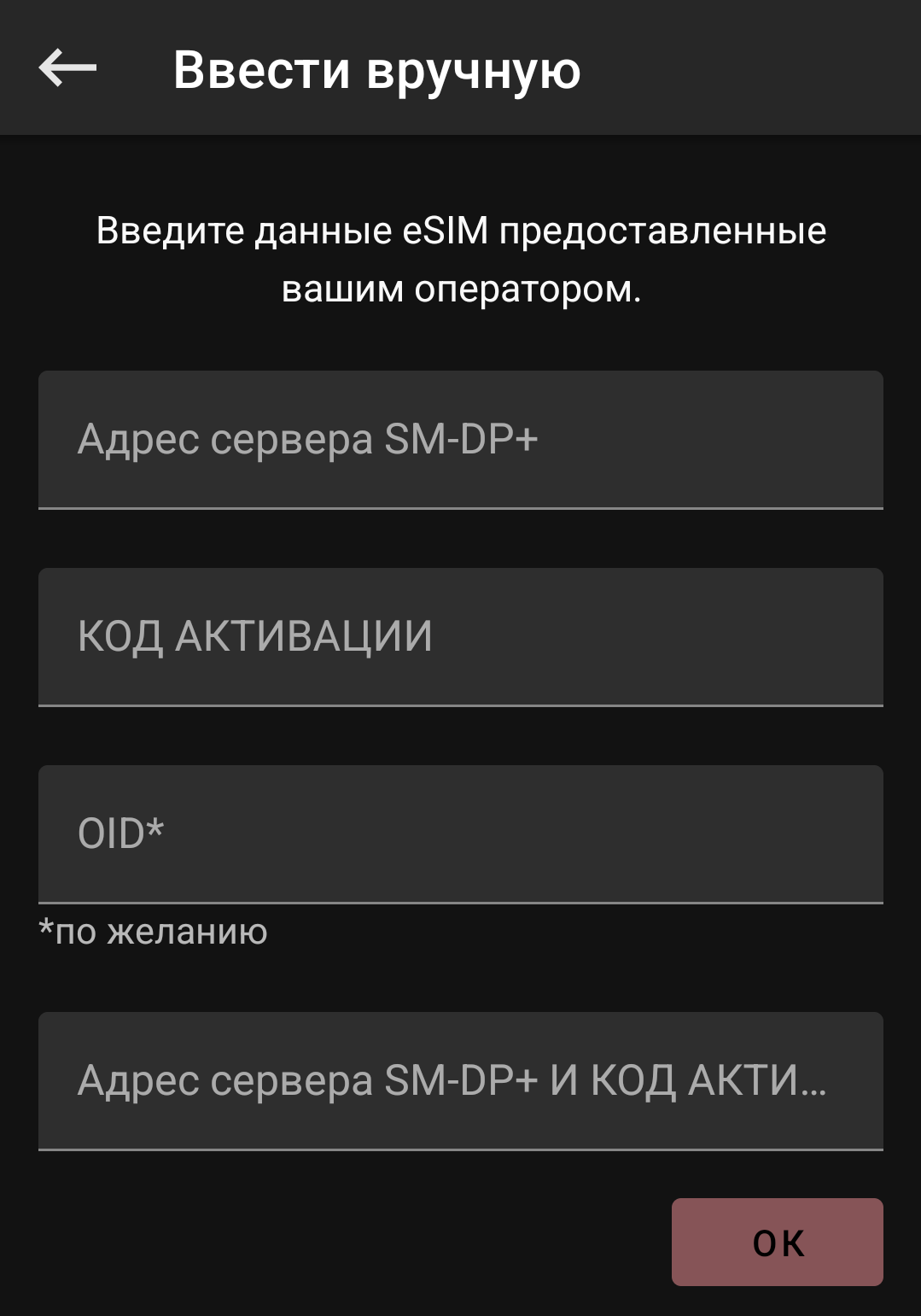 • OID (он же код подтверждения; обязательно при условии, что вам его предоставил ваш eSIM-провайдер или мобильный оператор)