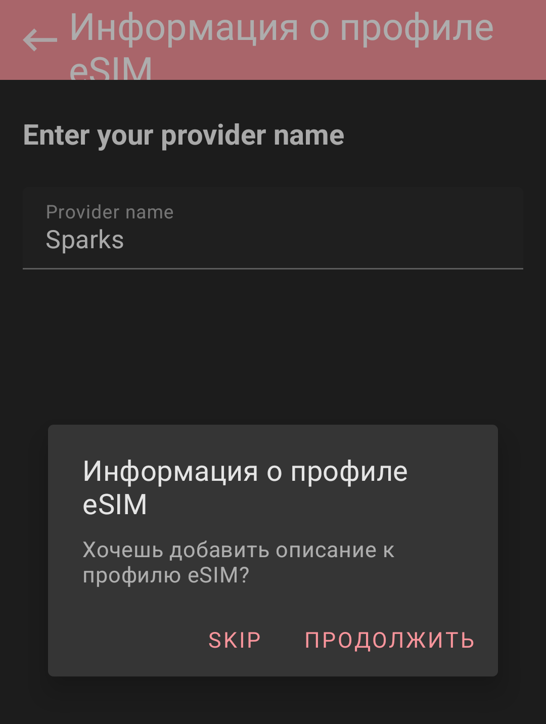 Нажмите по желанию в диалоговом окне «Продолжить», чтобы приступить к добавлению описания нового профиля eSIM (либо Skip, чтобы пропустить это действие):