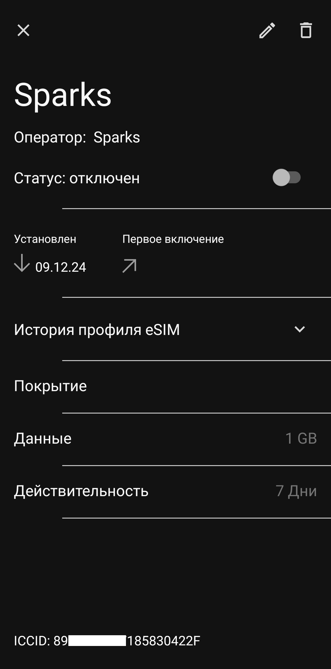 Нажмите на добавленный профиль eSIM, чтобы открыть его описание, и активируйте переключатель напротив статуса, чтобы начать использовать этот профиль: