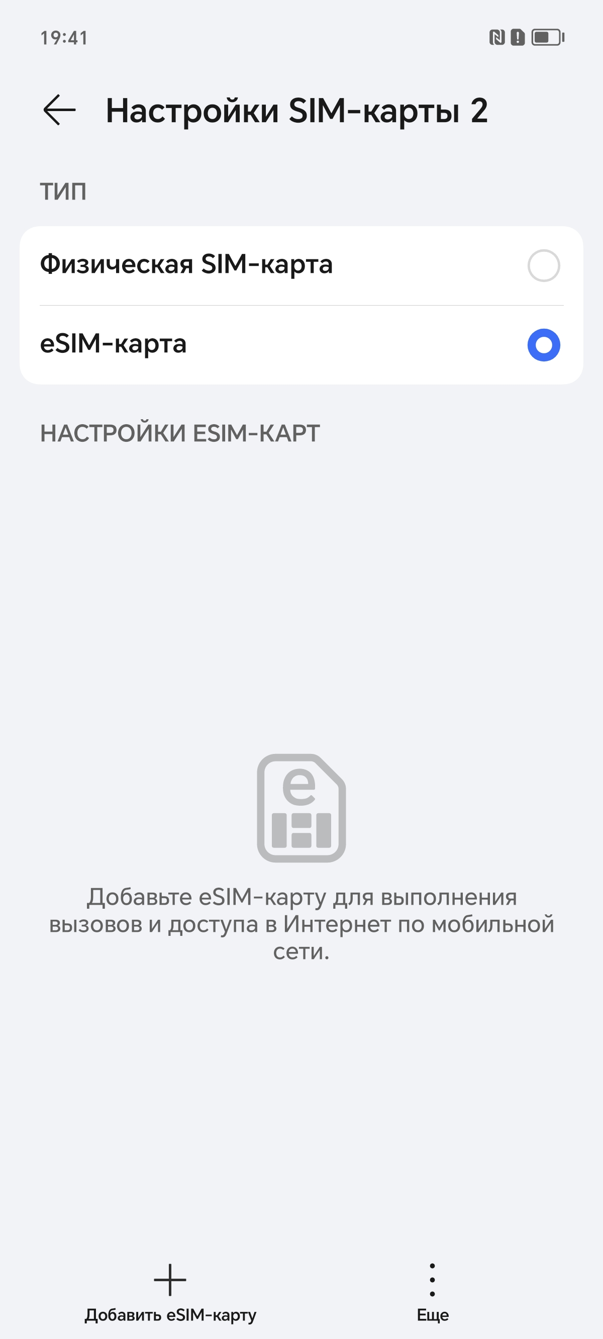 Убедитесь, что установлен тип «eSIM-карта», затем нажмите на кнопку «Добавить eSIM-карту» внизу экрана: