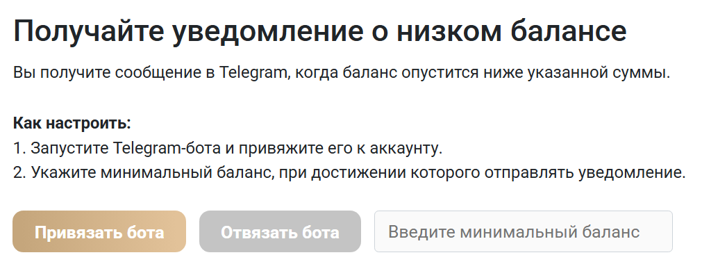 Разработчики предусмотрительно разместили настройку в личном кабинете, в разделе «Уведомления о балансе». Всё строго, логично и без сюрпризов.